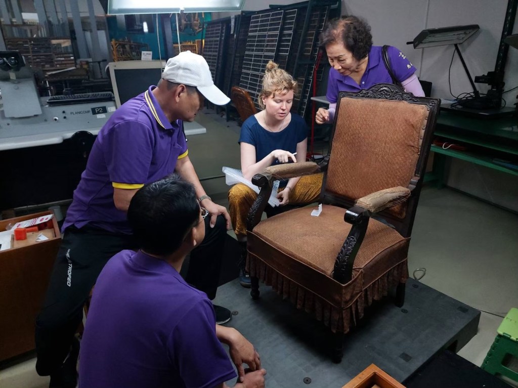 ROCMA requested stabilisation of the dusty and damaged upholstery, part of a museum display recreating CKS’s office. Work was carried out in NSTM’s Open Storage area, where visitors can engage directly with conservators. Visitor perceptions of the chairs often changed when learning of their provenance, simultaneously revealing the contentiousnature of CKS and his legacy to Taiwanese cultural identity. The conservator, as a non-Taiwanese, was in turn informed by the reactions of Taiwanese visitors and heritage workers, thereby developing a deeper understanding of the values embedded in the armchairs as perceived by its stakeholders, and questioning the neutrality of such treatments.